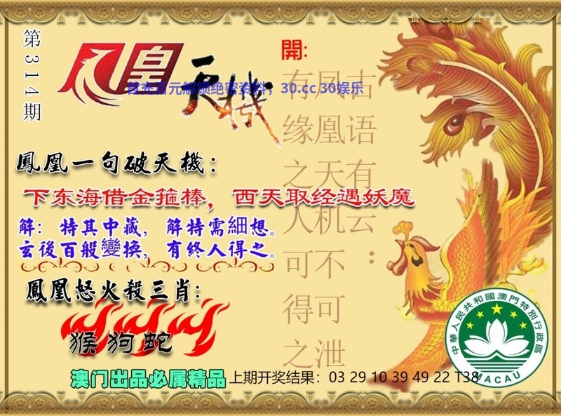 | 314期:凤凰一句破天机:下东海借金箍棒,西天取经遇妖魔 六肖中特:牛羊虎蛇鸡兔 四肖中特:牛羊虎蛇 绝杀一肖:狗狗狗 精选12码:17.29.23.35.16.28.25.37.21.33.15.27 |