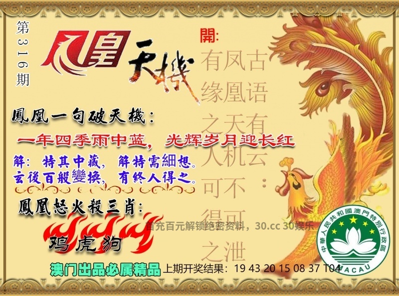 | 316期:凤凰一句破天机:一年四季雨中蓝,光辉岁月迎长红 六肖中特:狗马虎龙兔蛇 四肖中特:狗马虎龙 七尾中特:0134678 绝杀一肖:鸡鸡鸡 精选12码:20.32.24.36.16.28.14.26.15.27.25.37 |